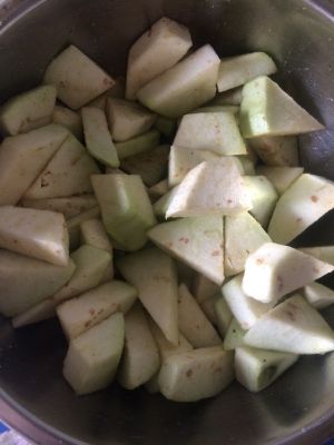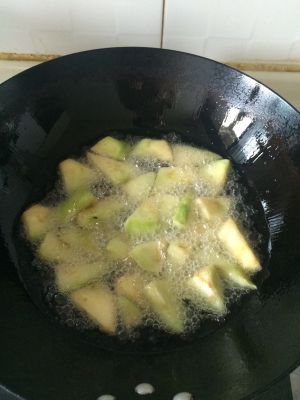 锅内放油烧至五成热放入茄块炸至金黄色捞出控油备用。