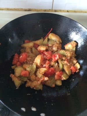 放入郫县豆瓣和番茄酱,再依次放入青红椒、木耳、茄子。放入调料汁,快熟之后收汁。