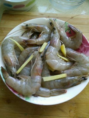 首先,洗净大虾,剪去虾线,挑去虾线,能开背更好,入味且方便去除虾线,剪掉过长的虾须。用姜和料酒腌大约15分钟。