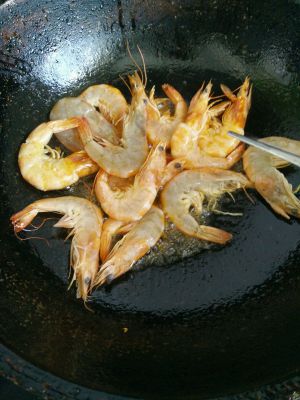 锅中放较多的食用油烧热,将腌好的大虾下锅煎炸,轻压虾头炒出红油,炸至表皮略微酥脆盛出。