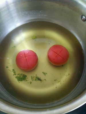 番茄划十字刀口,大点的番茄一个就够,略微烫一下方便去皮。(我上一道菜刚做完炒西兰花,就直接用焯西兰花的水烫番茄了╮(╯▽╰)╭)烫好番茄去皮切块备用。葱姜蒜切末。