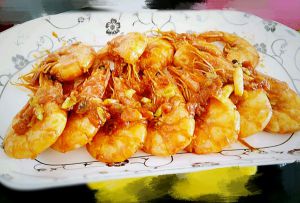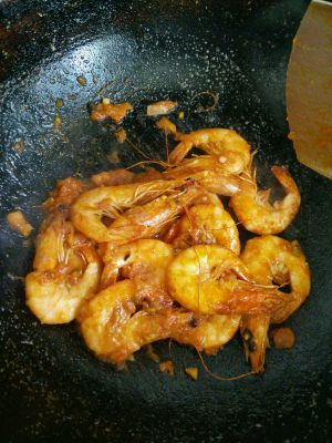 酱汁炒好后,转大火,将炸好的大虾下锅,让虾子均匀裹上酱汁,翻炒几下加一碗水,适量盐,焖煮10分钟。