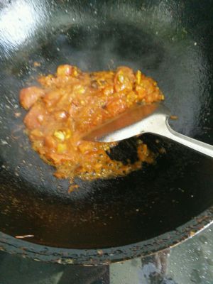 锅中底油下葱姜蒜末炒香,转小火下去皮番茄块及少量番茄酱炒出酱汁,汤汁较为浓稠时放一汤匙耗油,一汤匙白糖,一小勺胡椒粉及两汤匙生抽。
