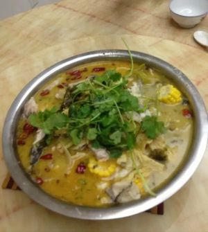 将鱼头鱼尾等制汤材料倒入锅中熬煮出香味,把时令蔬菜烫熟一一放入,我放的有(菜花,玉米,芋头切块,酸菜,金针菇,腐竹片或腐竹条),试下味,适量加调料,将腌制鱼片倒入锅中,旺火烫至变色断生,起锅,连汤带鱼片倒入保温砂锅内。将炸香的花椒粒、干红椒段铺在鱼片上,撒上切段的葱花,香菜,烧滚1大勺油浇淋上。