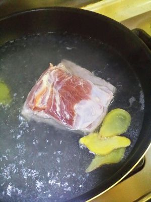 锅内放水拍一块生姜和五花肉一起煮10分钟