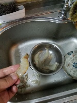 新鲜的活虾去头,去头时不要太用力把虾线慢慢带着抽出来