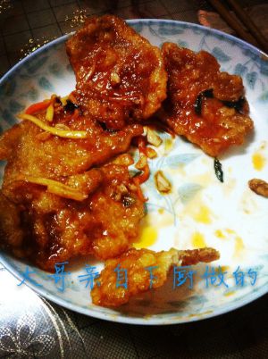 少许油,先放姜丝,再放番茄酱、醋、糖、水调好的碗汁,再放入水淀粉、葱丝,汁熬好后放入肉片,出锅,好吃极了。