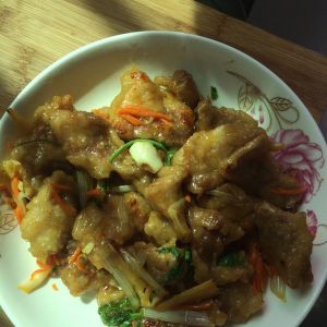 捞一勺热油浇入调好的汁中,锅里少许油,放入葱姜爆炒,放入炸好得里脊肉,浇汁掂勺,均匀即可装盘