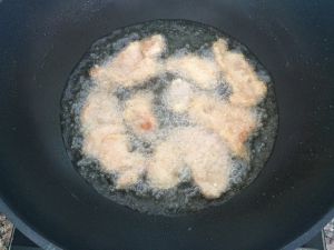 油烧八成热,下入蘸匀淀粉的肉片,炸至外面稍硬捞出,油再次烧至八成热,下入肉片二次炸制至外酥里嫩。