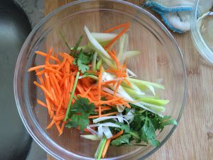 放入,胡萝卜丝,大葱丝,姜丝,蒜片,最后放香菜。