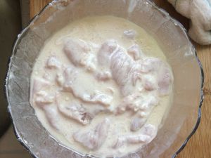 用面粉、玉米淀粉调糊,我用大概1:1的比例,调好后把肉放进去,每片都沾上些,准备油锅就可以炸了。
