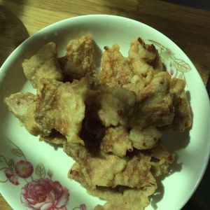把淀粉加水弄匀。肉切片用淀粉抓匀。 锅中放油。油开。 把用淀粉包裹的肉放入锅中油炸。炸金黄色捞出。