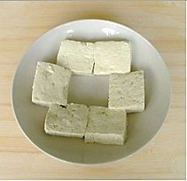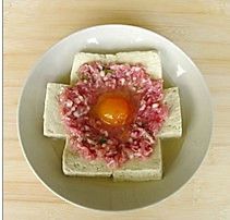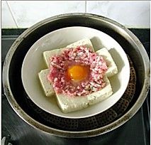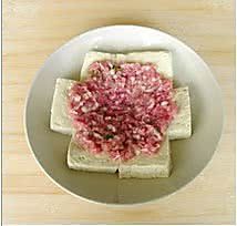 肉末加葱姜末、料酒、盐、生抽拌匀,铺在臭豆腐上面;