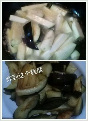 锅中放入多一些的油,油热到七八成时放入茄子,炸到软烂捞出备用。