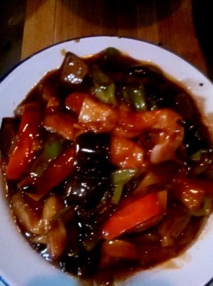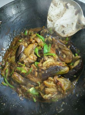 锅内重新倒入少许油,将切好的葱蒜入锅爆香,将调好的汁倒入锅内,然后将之前炸好的茄子放入锅中翻炒,待茄身沾满调汁,将切好备用的青椒放入锅中,翻炒几下即可出锅(第一次尝试做,但味道家人说还不错)