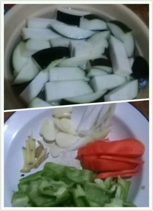 首先把茄子切成长条状,要稍微大点哦,放入水里,然后捞出控水。把其他的配菜也切好哦,大蒜切成片哦。