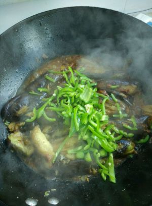 要熟的时候把茄子弄开,入点味道。加入尖椒,微微有点辣味是最好的。