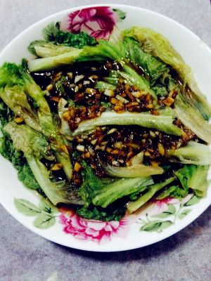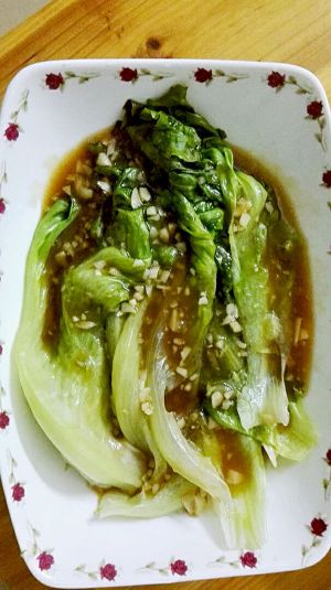 先煮一锅水将生菜烫熟后撩上来放入盘中,再热油将剁碎的蒜头炒一下加入调好的蚝油和生粉水鸡精炒一下淋到生菜上面就可以了
