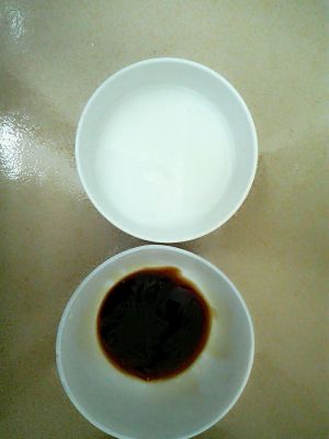 用开水将生粉搅拌均匀,将蚝油和酱油放一起搅拌一下,(酱油根据个人口味放本人比较重口味所以放的有点多