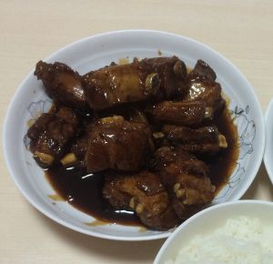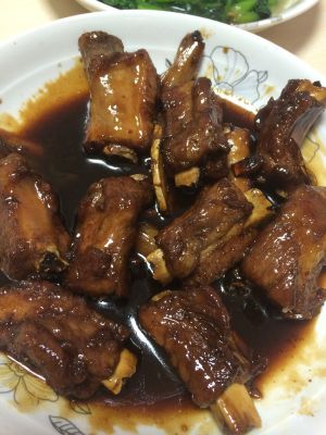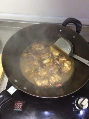 锅内放油少许,放入白糖。变色后放入煮好的排骨,两面都煎黄时,放少许醋。加入煮肉时的汤,收汁后可出锅。