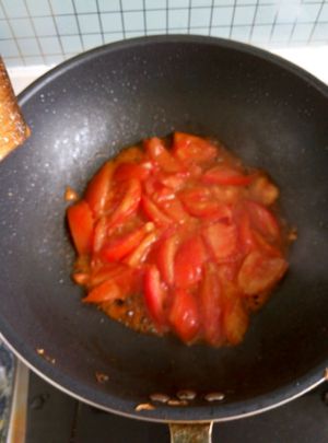 不用洗锅,下葱姜炒香,下西红柿炒出汤汁。