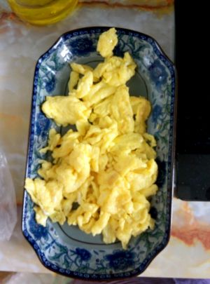 锅中放比平时炒菜多一点油,下蛋液,滑散。盛出备用。