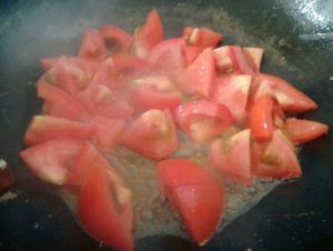 热锅再倒入适量食用油,油热后倒入切好的西红柿块快速翻炒