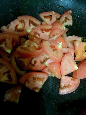 在将西红柿倒入锅中,一起炒均匀,在加一点番茄酱。