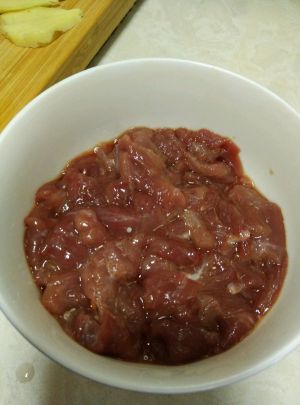 牛肉切片,放盐,料酒,酱油,淀粉煨上。