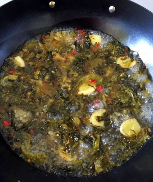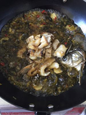 酸菜洗干净,准备泡椒六七个,姜六七片,蒜四五个。锅热倒油,加入青花椒1把,姜蒜爆香,放入酸菜和泡椒一起翻炒,加入煮好的鱼汤焖煮十分钟,中间放入春笋煮。