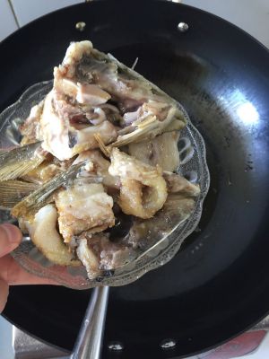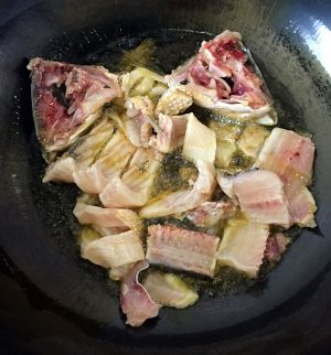 锅里倒油,是平时的炒菜的两倍。这样做出的酸菜鱼就不会清汤寡水的了。锅里烧热,下鱼头鱼骨下火煎