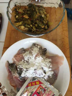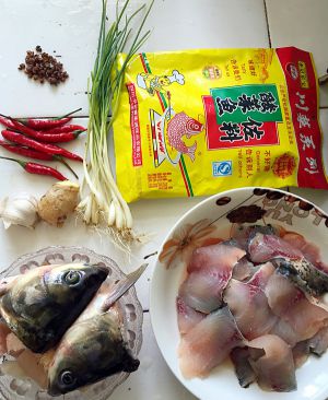 准备好材料,我的草鱼是菜市场买的新鲜的,我让老板帮我片好了,鱼头,鱼骨,鱼片分开。女孩子弄这个不方便。酸菜鱼的作料是超市买的,这个牌子我一直在用,它的酸菜跟脆,很香,味道很足!