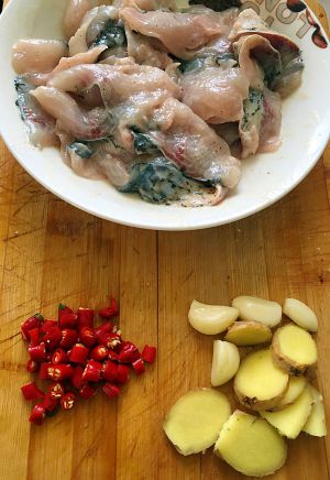 鱼片拌着调料手抓均匀,腌制十分钟。小米椒,生姜大蒜切碎备用