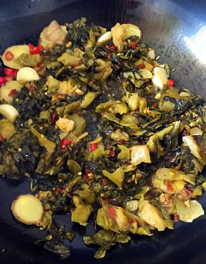 热油锅,放入葱头、姜、干辣椒、酸辣椒爆香,倒入炒干水的酸菜翻炒。