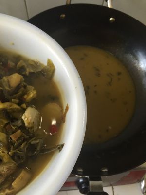 锅里鱼头,鱼骨,酸菜全部捞出放到碗里,锅里汤水备用!