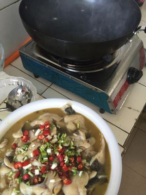 起锅,倒油,爆香尖椒和青花椒,直接倒到鱼片上。