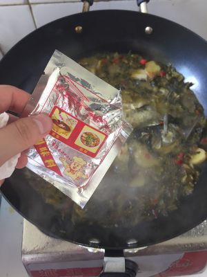 锅内放油加热,放葱姜蒜,酸菜包,辣椒包,翻炒。