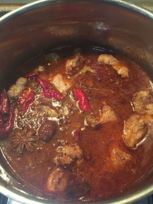 然后上色后放入四小勺老抽 加上开水 没过肉 然后放入 花椒 八角 桂皮 丁香 香叶 葱姜蒜 蜂蜜两勺 大火开后 转小火