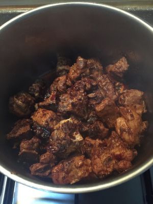 压:当排骨表面金黄时,加入2勺老抽、生抽、六月鲜甜面酱4勺、冰糖、加入水,将盖压15分钟!