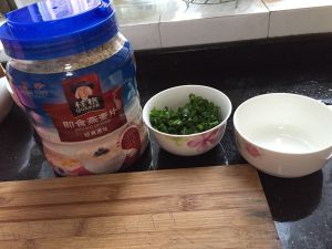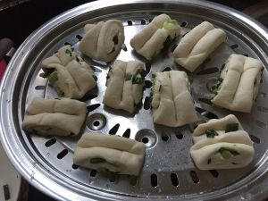 抓出一团发好的面,葱花里面加入盐混匀,用面擀擀开,铺上葱花,然后像寿司那样卷起