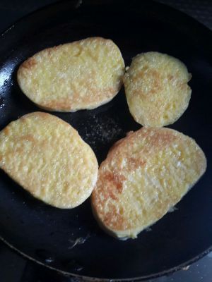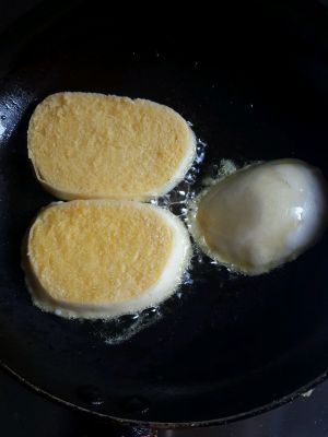 平底锅放适量油,每片馒头沾上鸡蛋液。煎制