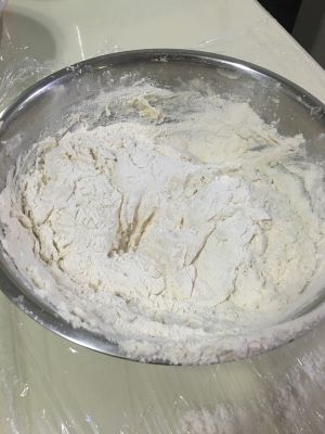 然后缓慢地往老面团水里加入面粉,用手搅和成面絮,然后放手揉成三光面团(盆光,手光,面光)