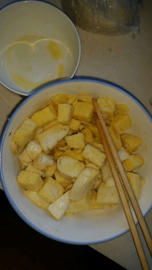 鸡蛋打进盘子里,打匀,放少许盐,把馒头条裹上蛋液