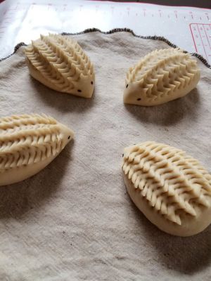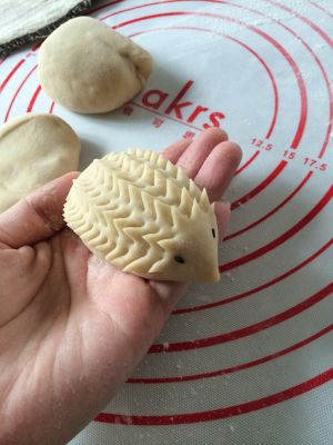 将酵母放进红糖水化开倒入面粉,拌匀揉成光滑面团发至两倍大后排气再揉光分四份,整形成一头尖一头圆,用剪刀剪出刺猬的刺,两粒芝麻做眼睛
