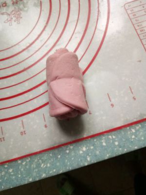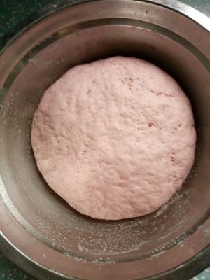 差不多和好的有一点点湿的面粉里加入煮熟或者蒸熟剥皮碾碎的紫薯泥。