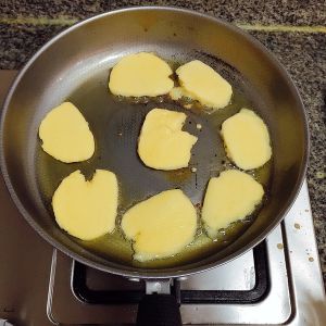 热锅放少许油,馒头片放入锅里煎至两面金黄色即可出锅