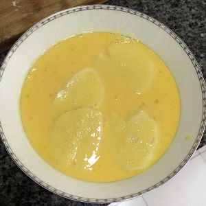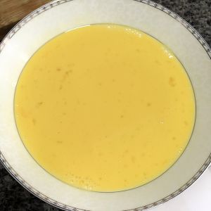 鸡蛋,牛奶,水淀粉(就是淀粉加水调和以后放入),白糖,搅拌均匀。