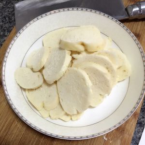 将馒头切成1.5cm薄片、注意菜刀沾一点点水切不易碎