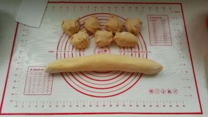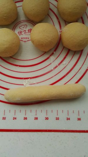 发酵好的面团排气,然后分成80克一个,再6等分(一个量少点),5个面团擀成圆形,小面团搓成长条,如图拍放。