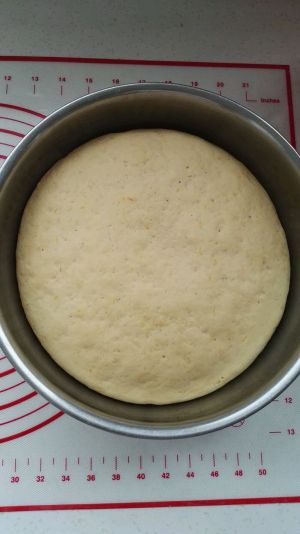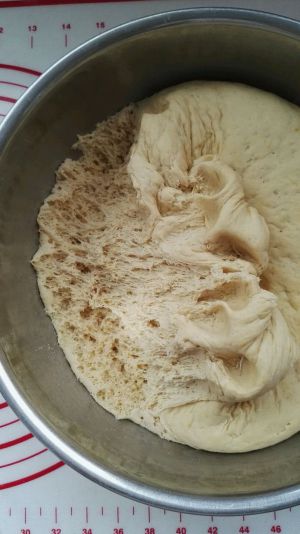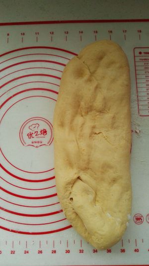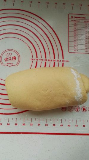 发酵好的面团取出放在揉面垫或案板上(需撒干粉防粘)。